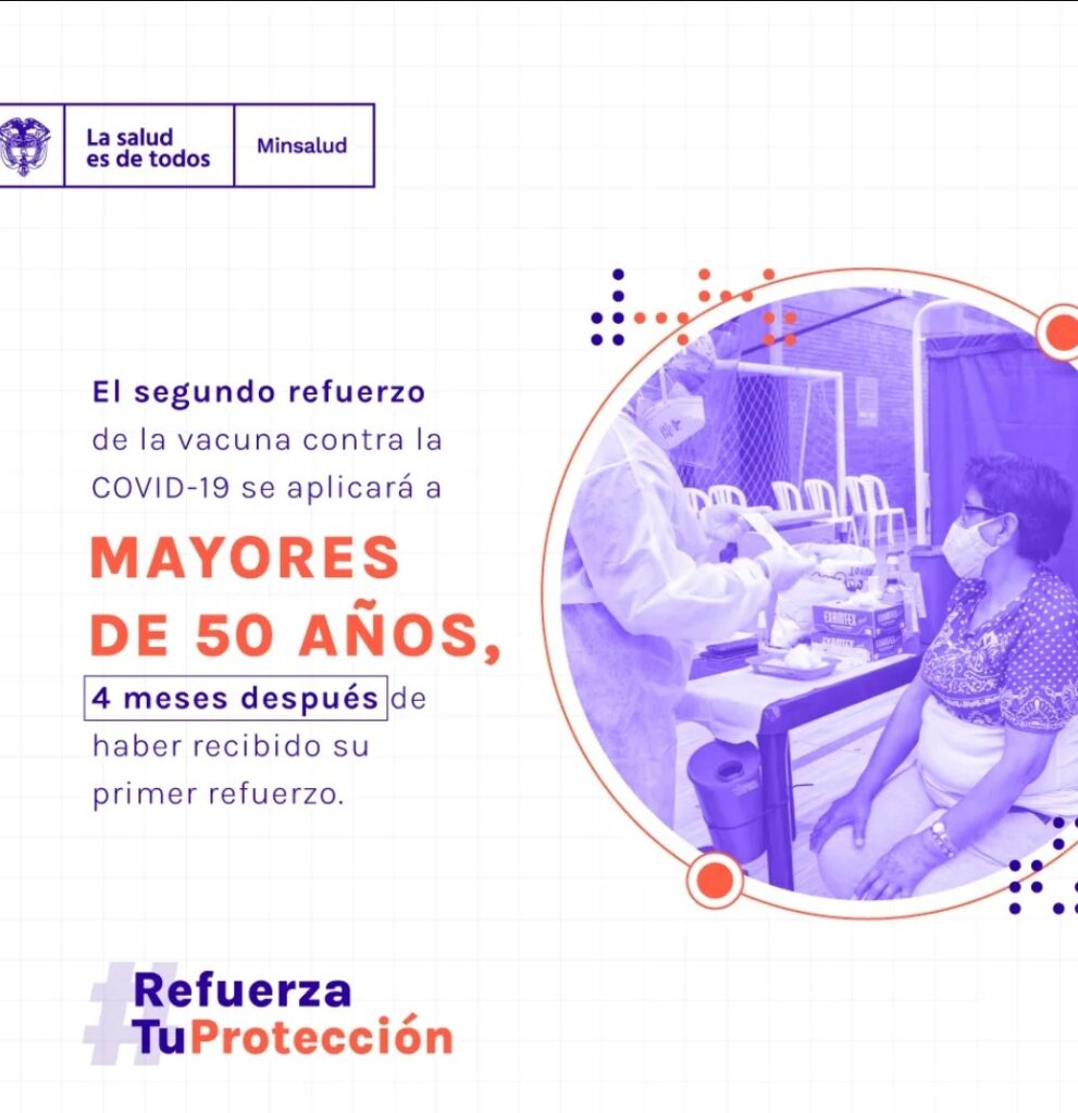 30Abr ATENCION by admin En Colombia, los mayores de 50 años ya se pueden aplicar un segundo refuerzo de la vacuna contra la COVID-19, 4 meses después de haber recibido su primer refuerzo. #RefuerzaTuProtección💪. Navegación de entradas right-arrow2Previous Post Promoción de los servicios Next Postright-arrow PARTICIPACIÓN SOCIAL